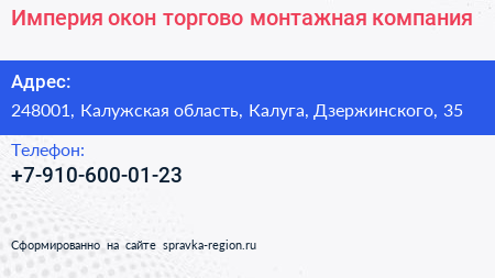 Империя окон, торгово-монтажная компания по адресу 248001, Калужская область, Калуга, Дзержинского, 35 в дальнейшем Организация, размещена в следующих категориях: