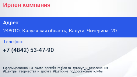 Ирлен, компания по адресу 248010, Калужская область, Калуга, Чичерина, 20 в дальнейшем Организация, размещена в следующих категориях: