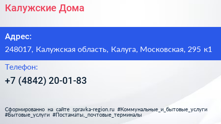 Калужские Дома по адресу 248017, Калужская область, Калуга, Московская, 295 к1 в дальнейшем Организация, размещена в следующих категориях: