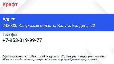 Крафт по адресу 248003, Калужская область, Калуга, Болдина, 22 в дальнейшем Организация, размещена в следующих категориях: