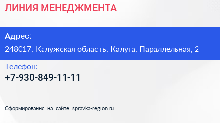 ЛИНИЯ МЕНЕДЖМЕНТА по адресу 248017, Калужская область, Калуга, Параллельная, 2 в дальнейшем Организация, размещена в следующих категориях: