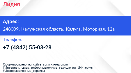 Лидия по адресу 248009, Калужская область, Калуга, Моторная, 12а в дальнейшем Организация, размещена в следующих категориях: