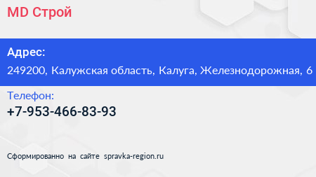 MD Строй по адресу 249200, Калужская область, Калуга, Железнодорожная, 6 в дальнейшем Организация, размещена в следующих категориях: