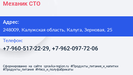 Механик, СТО по адресу 248009, Калужская область, Калуга, Зерновая, 25 в дальнейшем Организация, размещена в следующих категориях: