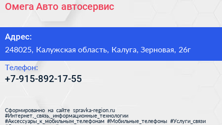 Омега-Авто, автосервис по адресу 248025, Калужская область, Калуга, Зерновая, 26г в дальнейшем Организация, размещена в следующих категориях: