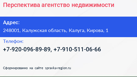 Перспектива, агентство недвижимости по адресу 248001, Калужская область, Калуга, Кирова, 1 в дальнейшем Организация, размещена в следующих категориях: