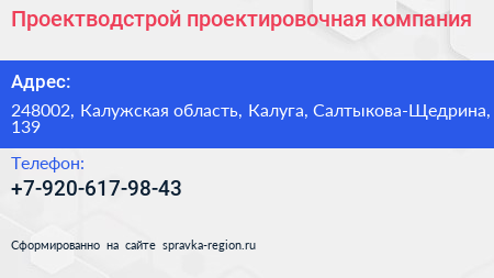 Проектводстрой, проектировочная компания по адресу 248002, Калужская область, Калуга, Салтыкова-Щедрина, 139 в дальнейшем Организация, размещена в следующих категориях: