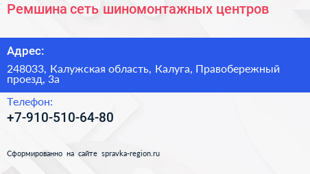 Ремшина, сеть шиномонтажных центров по адресу 248033, Калужская область, Калуга, Правобережный проезд, 3а в дальнейшем Организация, размещена в следующих категориях: