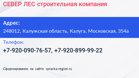 СЕВЕР-ЛЕС, строительная компания по адресу 248012, Калужская область, Калуга, Московская, 354а в дальнейшем Организация, размещена в следующих категориях: