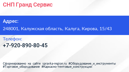 СНП Гранд Сервис по адресу 248001, Калужская область, Калуга, Кирова, 15/43 в дальнейшем Организация, размещена в следующих категориях: