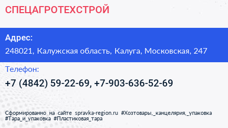 СПЕЦАГРОТЕХСТРОЙ по адресу 248021, Калужская область, Калуга, Московская, 247 в дальнейшем Организация, размещена в следующих категориях: