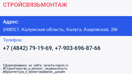 СТРОЙСВЯЗЬМОНТАЖ по адресу 248017, Калужская область, Калуга, Азаровская, 28г в дальнейшем Организация, размещена в следующих категориях: