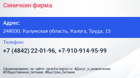 Синичкин, фирма по адресу 248030, Калужская область, Калуга, Труда, 15 в дальнейшем Организация, размещена в следующих категориях:
