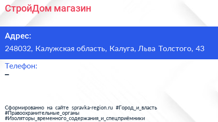 СтройДом, магазин по адресу 248032, Калужская область, Калуга, Льва Толстого, 43 в дальнейшем Организация, размещена в следующих категориях:
