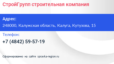 СтройГрупп, строительная компания по адресу 248000, Калужская область, Калуга, Кутузова, 15 в дальнейшем Организация, размещена в следующих категориях: