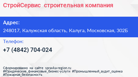СтройСервис+, строительная компания по адресу 248017, Калужская область, Калуга, Московская, 302Б в дальнейшем Организация, размещена в следующих категориях: