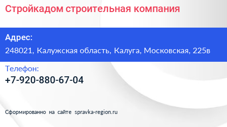 Стройкадом, строительная компания по адресу 248021, Калужская область, Калуга, Московская, 225в в дальнейшем Организация, размещена в следующих категориях: