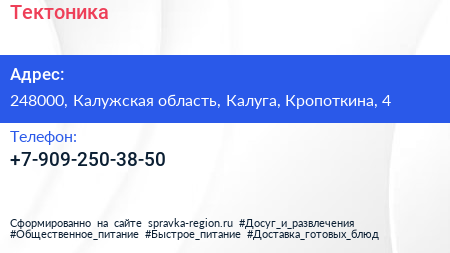 Тектоника по адресу 248000, Калужская область, Калуга, Кропоткина, 4 в дальнейшем Организация, размещена в следующих категориях: