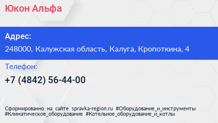 Юкон Альфа по адресу 248000, Калужская область, Калуга, Кропоткина, 4 в дальнейшем Организация, размещена в следующих категориях: