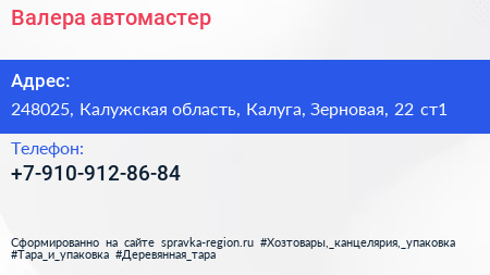 Валера автомастер по адресу 248025, Калужская область, Калуга, Зерновая, 22 ст1 в дальнейшем Организация, размещена в следующих категориях: