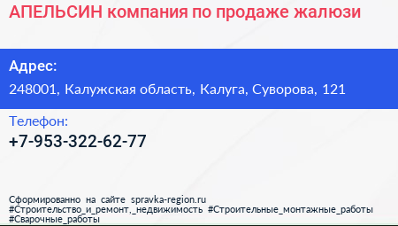 АПЕЛЬСИН, компания по продаже жалюзи по адресу 248001, Калужская область, Калуга, Суворова, 121 в дальнейшем Организация, размещена в следующих категориях: