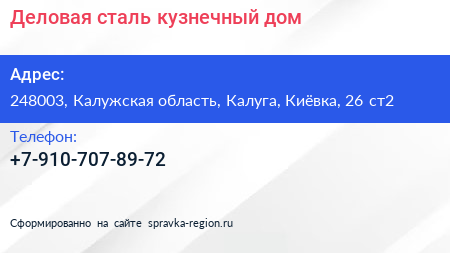 Деловая сталь, кузнечный дом по адресу 248003, Калужская область, Калуга, Киёвка, 26 ст2 в дальнейшем Организация, размещена в следующих категориях: