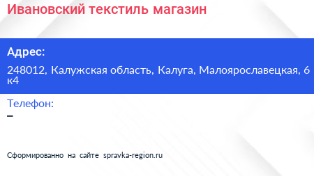 Ивановский текстиль, магазин по адресу 248012, Калужская область, Калуга, Малоярославецкая, 6 к4 в дальнейшем Организация, размещена в следующих категориях: