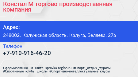 Констал-М, торгово-производственная компания по адресу 248002, Калужская область, Калуга, Беляева, 27а в дальнейшем Организация, размещена в следующих категориях: