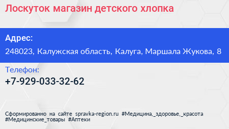 Лоскуток, магазин детского хлопка по адресу 248023, Калужская область, Калуга, Маршала Жукова, 8 в дальнейшем Организация, размещена в следующих категориях: