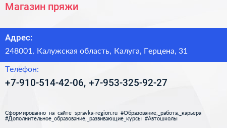 Магазин пряжи по адресу 248001, Калужская область, Калуга, Герцена, 31 в дальнейшем Организация, размещена в следующих категориях: