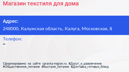 Магазин текстиля для дома по адресу 248000, Калужская область, Калуга, Московская, 8 в дальнейшем Организация, размещена в следующих категориях: