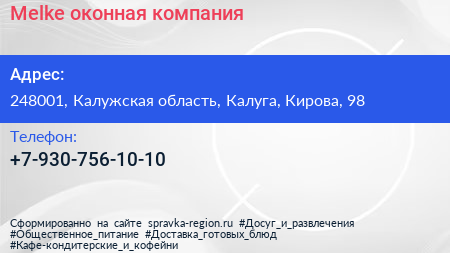 Melke, оконная компания по адресу 248001, Калужская область, Калуга, Кирова, 98 в дальнейшем Организация, размещена в следующих категориях: