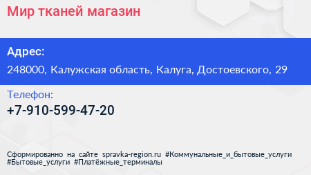 Мир тканей, магазин по адресу 248000, Калужская область, Калуга, Достоевского, 29 в дальнейшем Организация, размещена в следующих категориях: