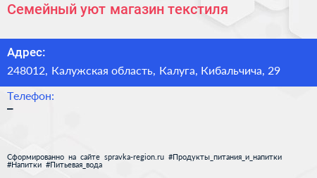 Семейный уют, магазин текстиля по адресу 248012, Калужская область, Калуга, Кибальчича, 29 в дальнейшем Организация, размещена в следующих категориях: