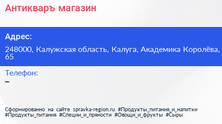 Антикваръ, магазин по адресу 248000, Калужская область, Калуга, Академика Королёва, 65 в дальнейшем Организация, размещена в следующих категориях:
