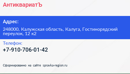 АнтиквариатЪ по адресу 248000, Калужская область, Калуга, Гостинорядский переулок, 12 к2 в дальнейшем Организация, размещена в следующих категориях: