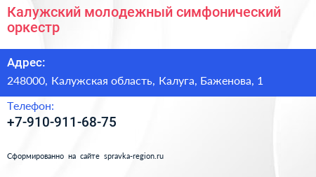 Калужский молодежный симфонический оркестр по адресу 248000, Калужская область, Калуга, Баженова, 1 в дальнейшем Организация, размещена в следующих категориях: