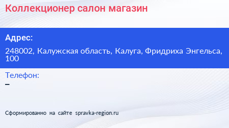 Коллекционер, салон-магазин по адресу 248002, Калужская область, Калуга, Фридриха Энгельса, 100 в дальнейшем Организация, размещена в следующих категориях: