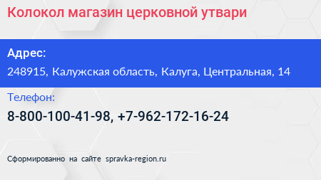 Колокол, магазин церковной утвари по адресу 248915, Калужская область, Калуга, Центральная, 14 в дальнейшем Организация, размещена в следующих категориях: