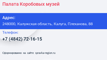 Палата Коробовых, музей по адресу 248000, Калужская область, Калуга, Плеханова, 88 в дальнейшем Организация, размещена в следующих категориях: