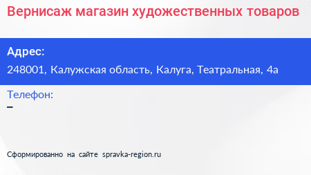 Вернисаж, магазин художественных товаров по адресу 248001, Калужская область, Калуга, Театральная, 4а в дальнейшем Организация, размещена в следующих категориях: