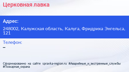 Церковная лавка по адресу 248002, Калужская область, Калуга, Фридриха Энгельса, 121 в дальнейшем Организация, размещена в следующих категориях: