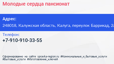 Молодые сердца, пансионат по адресу 248018, Калужская область, Калуга, переулок Баррикад, 2а в дальнейшем Организация, размещена в следующих категориях: