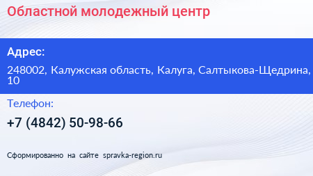 Областной молодежный центр по адресу 248002, Калужская область, Калуга, Салтыкова-Щедрина, 10 в дальнейшем Организация, размещена в следующих категориях: