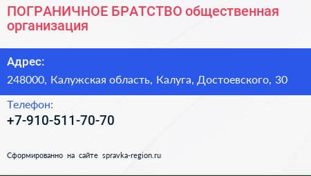 ПОГРАНИЧНОЕ БРАТСТВО, общественная организация по адресу 248000, Калужская область, Калуга, Достоевского, 30 в дальнейшем Организация, размещена в следующих категориях: