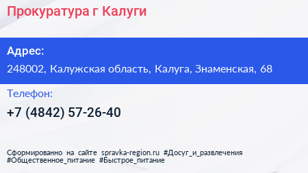 Прокуратура г. Калуги по адресу 248002, Калужская область, Калуга, Знаменская, 68 в дальнейшем Организация, размещена в следующих категориях: