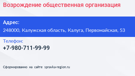 Возрождение, общественная организация по адресу 248000, Калужская область, Калуга, Первомайская, 53 в дальнейшем Организация, размещена в следующих категориях: