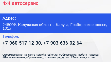 4х4, автосервис по адресу 248009, Калужская область, Калуга, Грабцевское шоссе, 101а в дальнейшем Организация, размещена в следующих категориях: