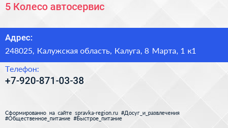 5 Колесо, автосервис по адресу 248025, Калужская область, Калуга, 8 Марта, 1 к1 в дальнейшем Организация, размещена в следующих категориях: