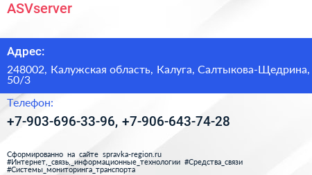 ASVserver по адресу 248002, Калужская область, Калуга, Салтыкова-Щедрина, 50/3 в дальнейшем Организация, размещена в следующих категориях:
